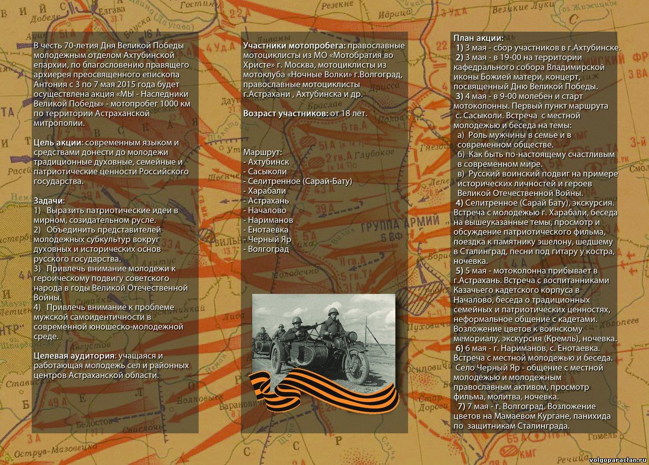| С 3 по 7 мая будет проходить мотопробег по территории волгоградской и астраханской области посвященный Дню Победы. Меня пригласили участвовать в качестве дополнения к мотоциклам. Моя задача рассказать народу что такое параплан и с чем его едят, поднять крыло ну и все такое... А теперь внимание вопрос!!! не найдется-ли у когого-нибудь доброго человека комплект для наземки на время проведения мероприятия. и вопрос номер два-еще желающие есть? может кто из мотористов?